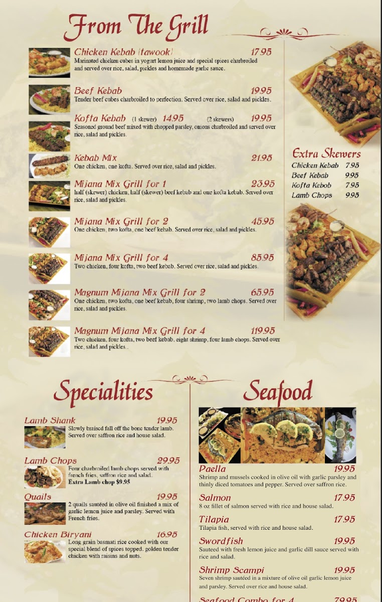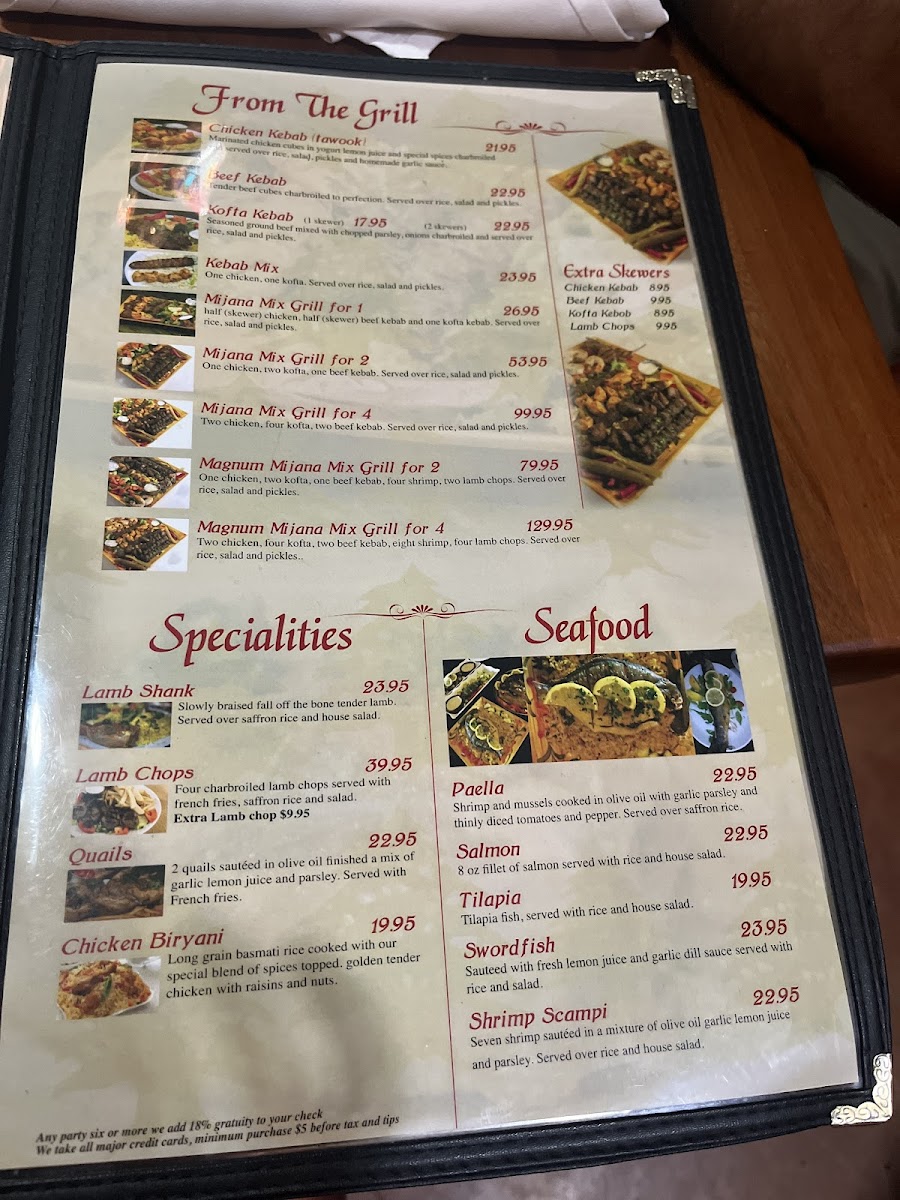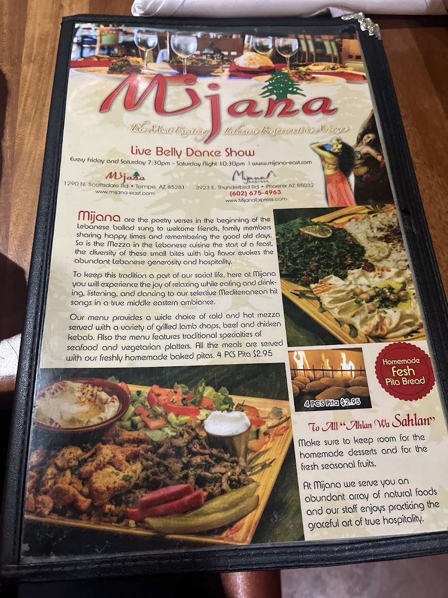 Looking for a place that brings the flavors of the Middle East to Tempe? Mijana Menu offers a wide range of dishes that combine traditional recipes with modern twists. Whether you're craving savory shawarma, hearty kebabs, or a fresh, vibrant salad, there’s something to satisfy every palate. The menu features everything from tender lamb dishes to flavorful vegetarian options, all crafted with fresh ingredients and a touch of spice. Pair your meal with a refreshing drink from their beverage list, or dive into a rich dessert to round off your dining experience. Located on N Scottsdale Rd, Mijana gives you the perfect spot to unwind with friends or enjoy a relaxed meal with family.